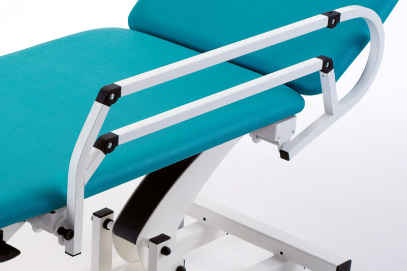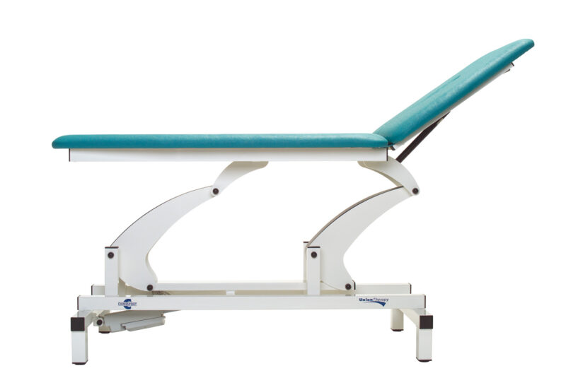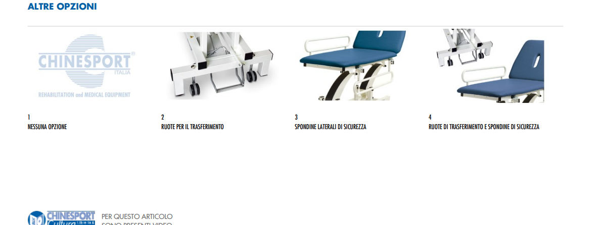 Letto da visita Chinesport è testato con sistema di regolazione servoassistito da molla a gas, con funzione di schienale, regolabile in positivo e in negativo. La testata è dotata di foro naso-bocca. La larghezza delle sezioni di cm 68. Regolazione dell’altezza idraulica o elettrica mediante pedaliera o barra perimetrale a bassa tensione (24V) da 47 a 97 cm.