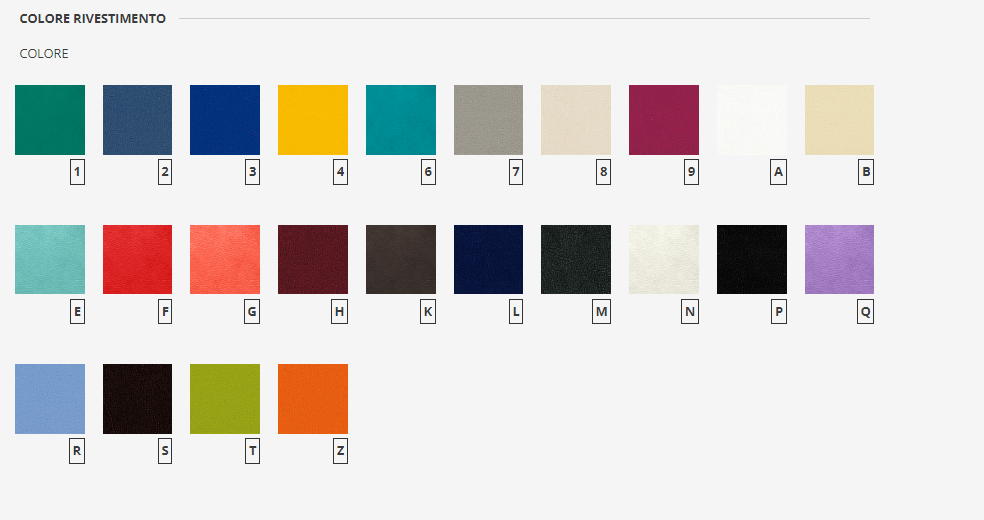 Colore lettino | 1) VERDE SCURO, 2) BLU CHIARO, 3) BLU MARINO, 4) GIALLO, 6) VERDE CHIARO, 7) GRIGIO CENERE, 8) BEIGE, 9) FUCSIA, A) BIANCO, B) CREMA, E) ACQUAMARINA, F) ROSSO, G) CORALLO, H) BORDEAUX, K) GRIGIO, L) BLU SCURO, M) ANTRACITE, N) AVORIO, P) NERO, Q) LILLA', R) AZZURRO FIORDALISO, S) MARRONE SCURO, T) VERDE LIMONE, Z) ARANCIONE |