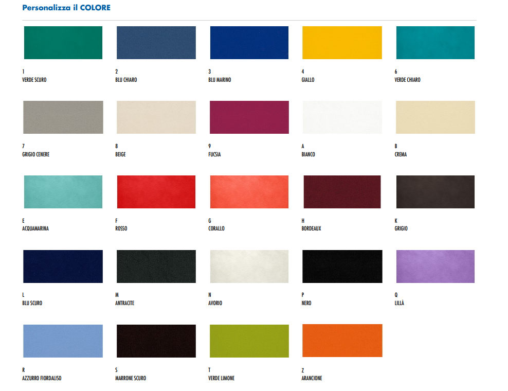 Colore lettino | 1) VERDE SCURO, 2) BLU CHIARO, 3) BLU MARINO, 4) GIALLO, 6) VERDE CHIARO, 7) GRIGIO CENERE, 8) BEIGE, 9) FUCSIA, A) BIANCO, B) CREMA, E) ACQUAMARINA, F) ROSSO, G) CORALLO, H) BORDEAUX, K) GRIGIO, L) BLU SCURO, M) ANTRACITE, N) AVORIO, P) NERO, Q) LILLA', R) AZZURRO FIORDALISO, S) MARRONE SCURO, T) VERDE LIMONE, Z) ARANCIONE |