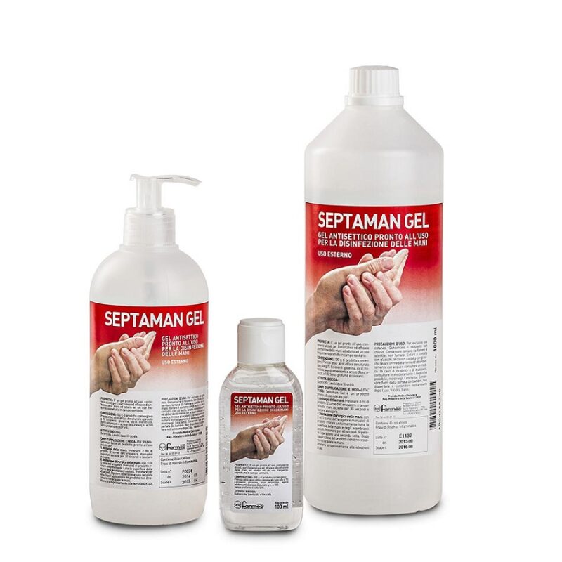 CARATTERISTICHE DEL PRODOTTO: Septaman Gel sono dei disinfettanti in soluzione alcolica incolori, in forma di gel, pronta all’uso per l’istantanea ed efficace disinfezione delle mani ed adatti ad un uso frequente, soprattutto in campo sanitario. Contiene alcool etilico.