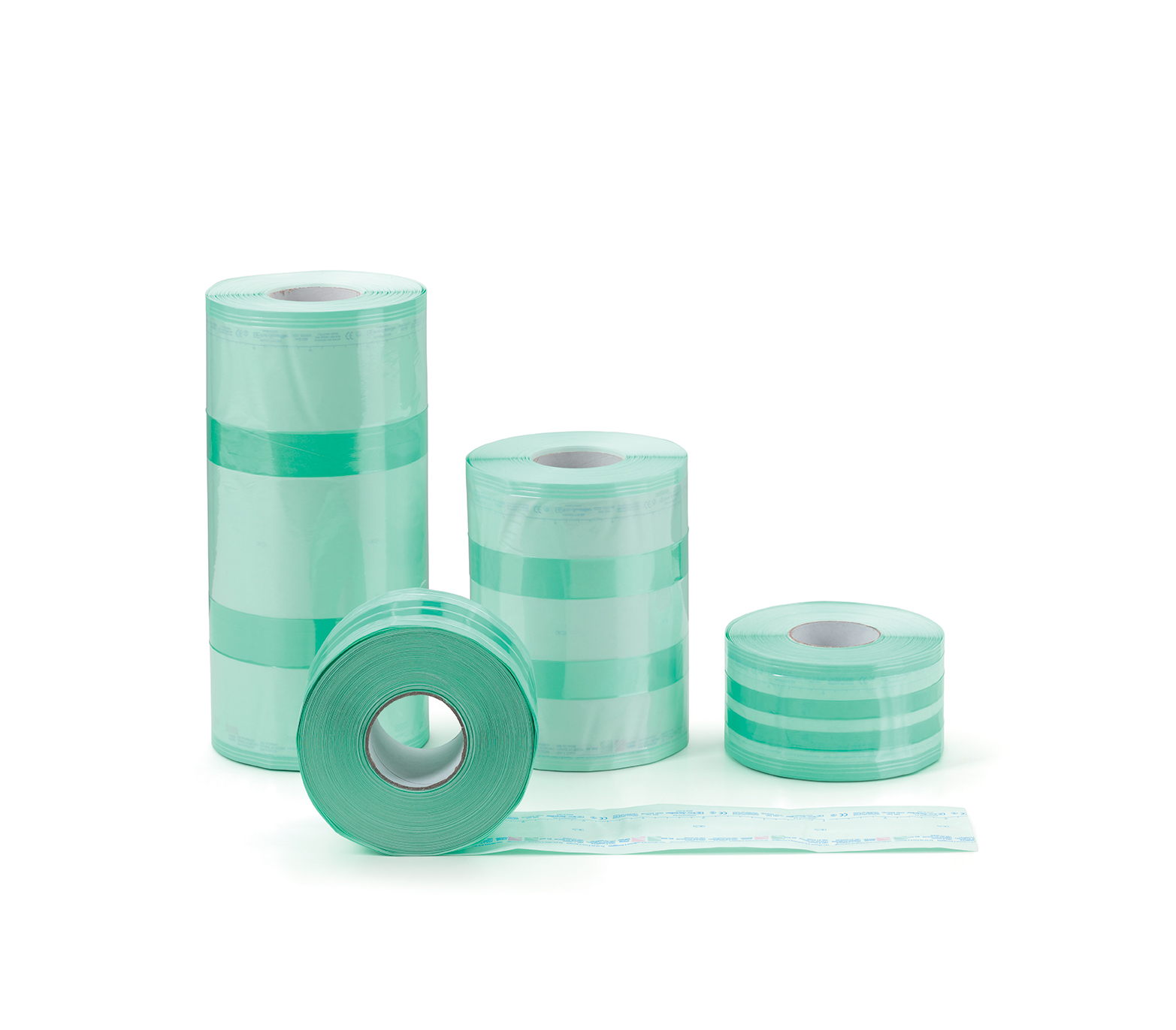 Rotoli soffietto per sterilizzazione a vapore (EtO) in autoclave composti da carta Kraft medicale e film plastico medicale con doppia piega.